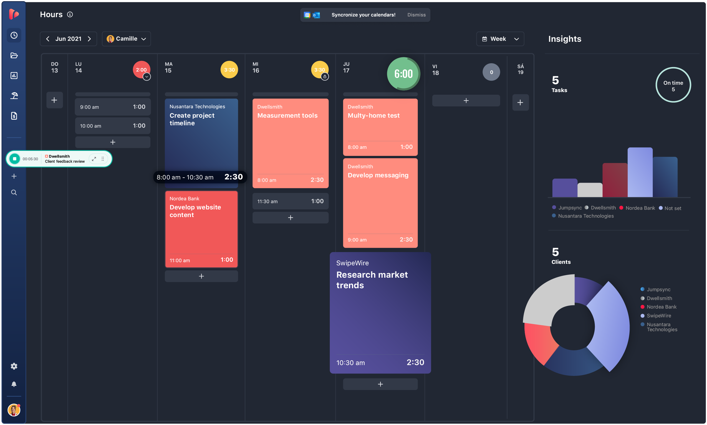 Rastreie suas horas sem depender da entrada manual de tempo, que muitas vezes pode levar a erros. Ao simplificar o processo, você pode se concentrar em suas responsabilidades principais e, em última análise, aumentar sua produtividade, resultando em entregas de projetos mais bem-sucedidas.